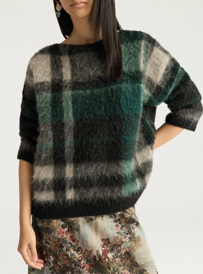 Tricot jacquard brossé avec motif maxi tartan en fil mohair. Coupe oversize avec manche fourreau et encolure bateau aux finitions nettes. Bas de manche et de vêtement en côte unie. Made in Italy.