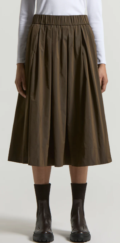 This long skirt, made from light but structured yarn-dyed technical taffeta, stands out for its full, sophisticated design.